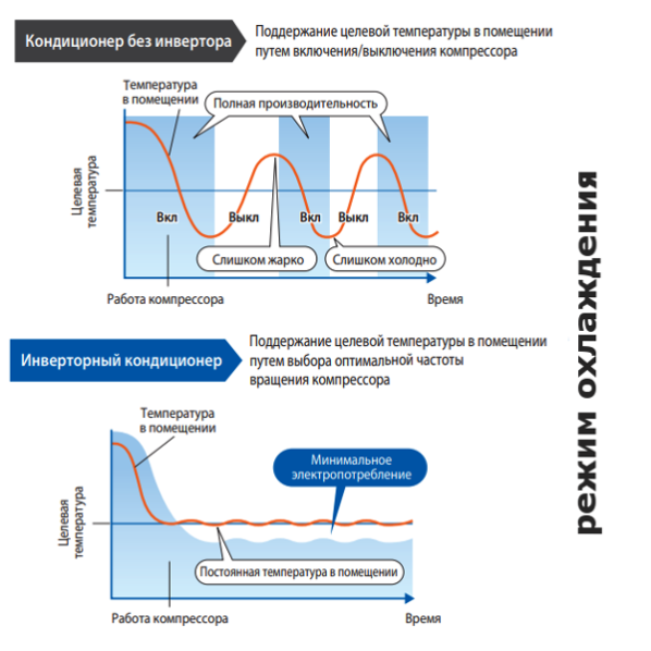 Обычные сплит-системы включаются и отключаются по мере достижения заданной температуры. То есть: